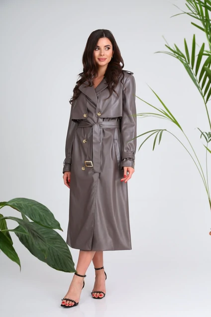 Плащ женский из экокожи прямого силуэта с центральной двубортной застежкой на петли и пуговицы, на подкладке. Перед с отлетными кокетками. По переду обработаны карманы с листочками. Спинка со средним швом и отлетной кокеткой. Рукава двухшовные втачные. По низу рукавов расположены паты с петлей и пуговицей , протянутые в шлевки. Воротник пиджачного типа. По линии талии расположены широкие шлевки, в которые протянут ремень с пряжкой. На плечевых швах обработаны паты со шлевкой, застегивающиеся на петлю и пуговицу. Длина по среднему шву спинки- 116см. Длина рукава- 64см.