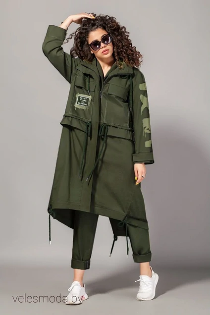 Плащ-тренч свободного силуэта с капюшоном. Застежка центральная на молнию. Рукав втачной, пата с кнопкой. На одном рукаве декоративная печать, также печать на спинке и на отлетной детали полочки и спинки. По капюшону, по отлетной детали и внизу плаща декоративный шнур в кулисах. По спинке кокетка со складкой, по полочке кокетка с клапаном. Под отлетной деталью полочки прорезные карманы. На спинке внизу разрез. Изделиевыполнено в джинсовом стиле. Длина изделия 119 см Длина рукава 53 см Рост 170 см