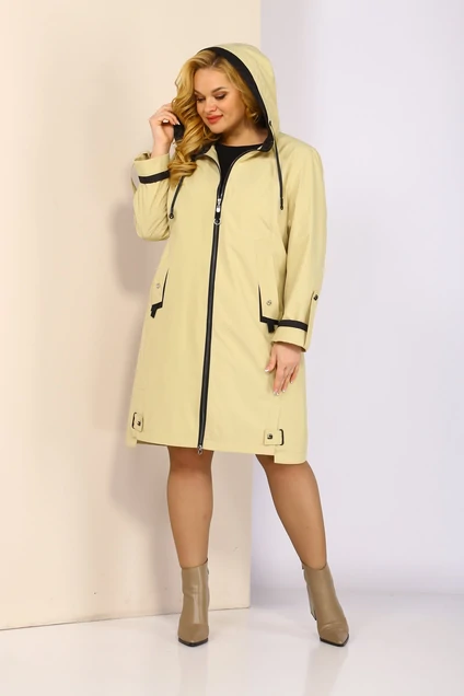 Легкий, элегантный весенний плащ. Изготовлен из плащевой ткани, без утеплителя, на подкладке. Достаточно плотная плащевка, при этом довольно мягкая. Капюшон изделия втачной, регулируется декоративной кулисой. Застежка центральная на молнии (двухбегунковая). По переду рельефные швы в которых расположены действующие карманы на кнопках. Рукав втачной длинный с манжетой и патой на кпопку. Боковые швы смещены в сторону полочки, что зрительно стройнит фигуру. Спинка с отрезной кокеткой и рельефными швами. Низ изделия фигурный. Изделие декорировано вставками черного цвета.