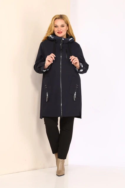 Современный, модный, легкий плащ. Изготовлен из плащевой ткани, без утеплителя, на подкладке. Достаточно плотная плащевка, при этом довольно мягкая. Капюшон изделия втачной, регулируется кулисой. Плащ свободного силуэта с регулирующийся, по линии талии, внутренней кулисой. Застежка центральная на молнии (двухбегунковая). Перед с нагрудными вытачками и функциональными накладными карманами на кнопках. Рукав втачной длинный с манжетой и патой на кнопку. Боковые швы смещены в сторону полочки, что зрительно стройнит фигуру. Спинка цельнокроеная с декоративной нашивкой и разрезом в нижней части. Низ изделия фигурный. Изделие декорировано вставками контрастного цвета с цветным принтом.