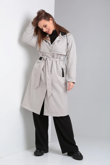 Модный, стильный плащ прямого силуэта, выполнен из качественной плащевой ткани, на подкладке. Рукав длинный, реглан с патой на кнопку. Воротник отложной со стойкой и капюшоном. Изделие с центральной застёжкой на кнопки с имитацией пуговиц . По переду и спинке плаща - отлетная кокетка. В передней части обработаны прорезные карманы с листочками. Капюшон контрастного цвета, съемный, регулируется декоративным шнуром. Талия акцентируется съемным поясом из основной ткани. Низ изделия на регулируемой кулисе.