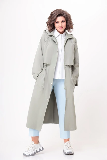Плащ женский прямого силуэта, выполнен из качественной голландской плащевой ткани. Рукав длинный, "реглан". Плащ со стойкой и капюшоном. Изделие с центральной застёжкой на тесьму-молнию. Молния закрыта планкой, которая застёгивается на пробивные декоративные кнопки. По переду и спинке плаща - отлетная кокетка. По спинке кокетки заложена встречная складка, которая застёгивается патой на пробивную кнопку. В нижней части переда обработаны прорезные карманы с листочками. Капюшон и талия регулируется двойными резинками и фиксаторами. В нижней центральной части спинки обработана шлица.
