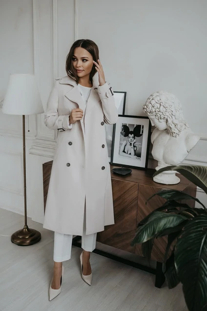 Плащ двубортный, по переду нижней части выполнены карманы с листочкой, спинка из отделочной ткани (красная клетка) со средним швом заканчивающаяся разрезом шлицы, на плечевых швах погоны. Рукав втачной длинный, по низу рукава настрочены шлевки. Плащ без пояса. Дл. плаща 109, дл рукава 62 см