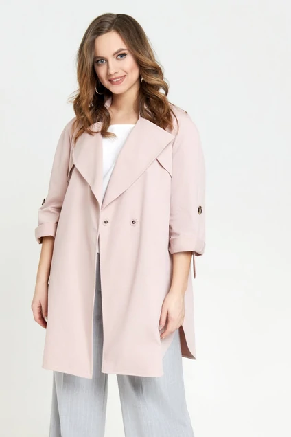 Легкий тренч свободного силуэта из джинсовой ткани. Рукав реглан длиной 5/6, регулируется патой. Широкий пиджачный воротник, по переду прорезные карманы с листочками. По бокам скругленные разрезы, сзади отлетная кокетка. Застежка двубортная на потайные кнопки. Изделие с поясом, без подкладки.
