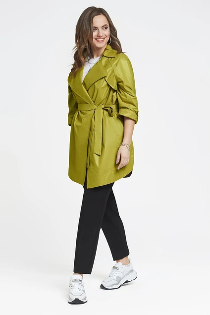 Легкий короткий тренч свободного силуэта из плащевой ткани. Рукав реглан длиной 5/6, регулируется патой. Широкий пиджачный воротник, по переду прорезные карманы с листочками. По бокам скругленные разрезы, сзади отлетная кокетка. Застежка двубортная на потайные кнопки. С поясом, на подкладке.