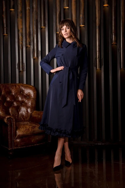 Плащ демисезонный, выполнен из плащевой ткани, на подкладке. На талии отрезной: по верхней части присборенный, по нижней части расклешенный. Застежка двубортная на петли и пуговицы. Спереди прорезные карманы. Воротник отложной. Рукав втачной. Плащ декорирован присборенной рюшей по низу и пришивным логотипом VL по карману. В комплекте пояс из основной ткани. Длина 119, рукав 59.