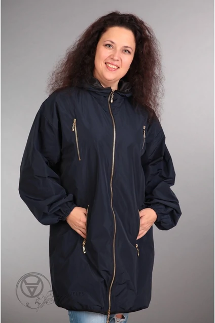 Плащ на подкладке с капюшоном. На полочке обработаны карманы с застежкой на молнию. Длина около 90 см.