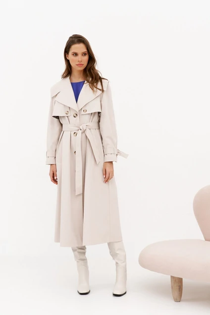 Тренчкот женский, оверсайз. Выполнен из х/б материала, изделие на подкладке. Рукав реглан на притачной манжете с патой по низу. Перед разрезной с отложным воротником, лацканами и отлетными кокетками. Изделие с застежкой на прорезные петли-пуговицы. По переду расположены прорезные карманы-«листочки». Спинка с отлетной кокеткой и шлице на пуговицах. Талию изящно подчеркивает съемный пояс с пряжкой. Длина макси, 122 см .
