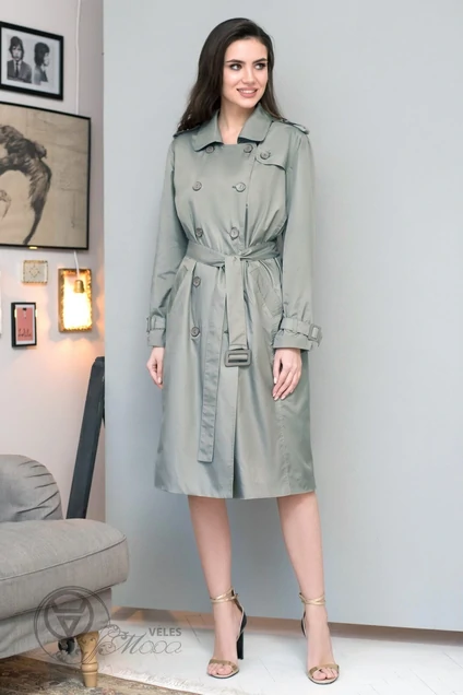 Плащ – это модный предмет гардероба, который всегда актуален! Плащ женский, прямого силуэта, двубортный с застёжкой на 10 петель и пуговиц, с отрезными боковыми частями, на подкладке, для повседневной носки. Перед с рельефными швами, выходящими из проймы, на левой части переда от плеча и проймы обработана отлетная кокетка, пристёгивающаяся на петлю и пуговицу. Чуть выше уровня линии бёдер обработаны карманы с листочкой. Спинка с рельефными швами, выходящими из проймы, на уровне линии талии по рельефным швам настрочены шлёвки, для вдевания завязывающегося пояса. Рукава втачные, двухшовные, длинные. По низу рукава притачаны шлёвки, для хлястика, который закрепляется пряжкой. Горловина обработана широким стояче-отложным воротником с отрезной стойкой. Концы воротника закруглённые. На плечевых швах настрочены шлёвки для протягивания хлястиков, застёгивающихся на 1 петлю и пуговицу. По рельефным швам спинки, переда, по листочке, по отлёту воротника, по краю борта прострочены двойные отделочные строчки, нитками в цвет основного материала. Длина плаща – 109см, длина рукава – 61см. Тип ткани: плащёвая.