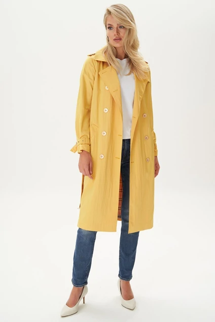 Элегантный женский тренч желтого цвета - стильный выбор для модных и уверенных в себе девушек. Выполненный из качественной ткани, он обеспечивает комфорт и защиту от непогоды, а классический крой подчеркивает женственность. Пояс на талии позволяет подчеркнуть талию и создать утонченный силуэт, а длина ниже колена делает тренч универсальным для любой погоды. Носите его с любимыми джинсами или классическими брюками для создания модного повседневного образа или сочетайте с платьем для более изысканного вечернего выхода. Плащ женский, прямого силуэта, двубортный с застежкой на 10 петель и пуговиц (размер и цвет фурнитуры может незначительно отличаться от фото), на подкладке, для повседневной носки.