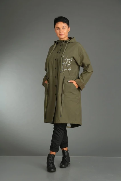 Плащ женский из легкой плащевой ткани свободного покроя с капюшоном,бз подкладки.Застежка -центарльная планка с кнопками. Плечо спущено. Рукав втачной с подворотами. По переду два настрочных кармана. По линии талии ,по низу и по капюшону настрочена кулиса со шнуром. Спинка с центральным швом,по низу обработан разрез. Декор-печать.