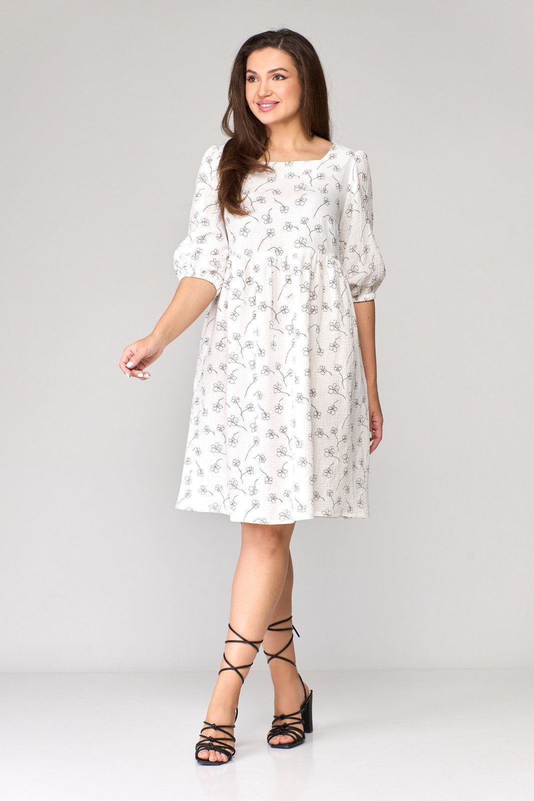 Платье 1003 цветы от коллекции бренда Abbi — идеальный выбор для летнего сезона. Изготовленное из легкого муслина, оно обеспечит комфорт даже в самый жаркий день. Оверсайз фасон с юбкой на сборке выгодно подчеркнет женственность. Особенностью платья являются квадратный вырез и глубокий V-образный вырез на спинке с завязками на плечах, придающие элегантный шарм. Длина до колена и рукава 3/4 на резинке делают это платье универсальным для любого мероприятия — от повседневного рабочего дня до праздника. Нежный цветочный принт делает образ свежим и воздушным.