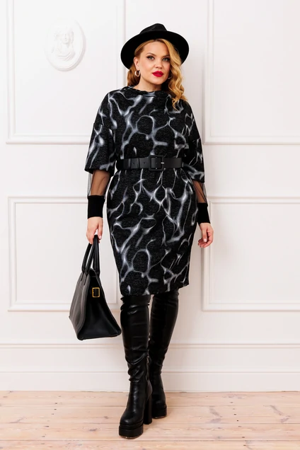 Стильное женское платье прямого силуэта, выполнено из высококачественной трикотажной ткани с модным дизайнерским принтом (ткань мягкая, приятная к телу, хорошо тянется). Горловина хомут, рукав спущенный, с отделкой из сетки с манжетой из трикотажного довяза, в боковых швах функциональные карманы. В комплекте идет съемный кожаный пояс. Модель стильная и практичная, невероятно стройнит, прекрасно подойдет для ежедневной носки, вы будете выглядеть неотразимо.