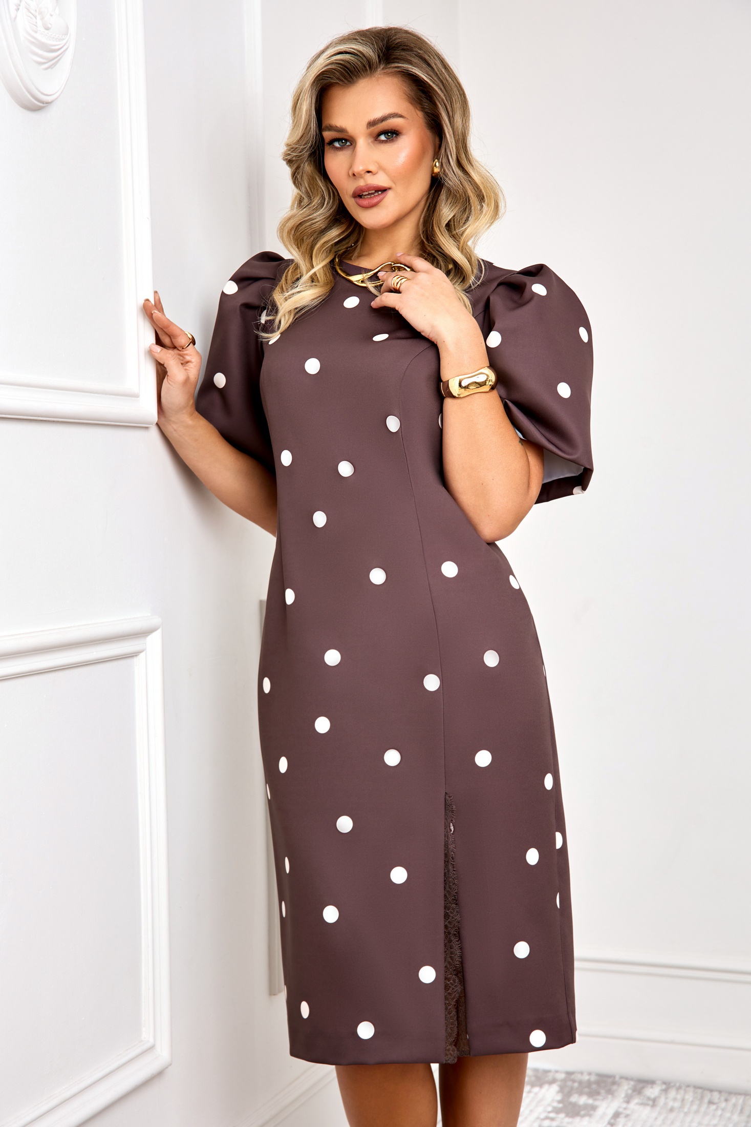 Роскошное нарядное платье, выполнено из плательной ткани Барби с добавлением вискозы с модным принтом горох. Платье с объемными рукава, что придает модели особый стиль и шарм. Платье прилегающего силуэта, вырез горловины округлый, по переду с разрезом и декорировано кружевом. По спинке платья потайная молния застежка. Модель прекрасно подойдет для торжественного мероприятия!