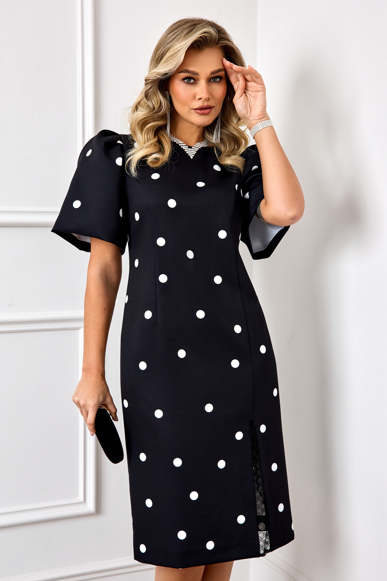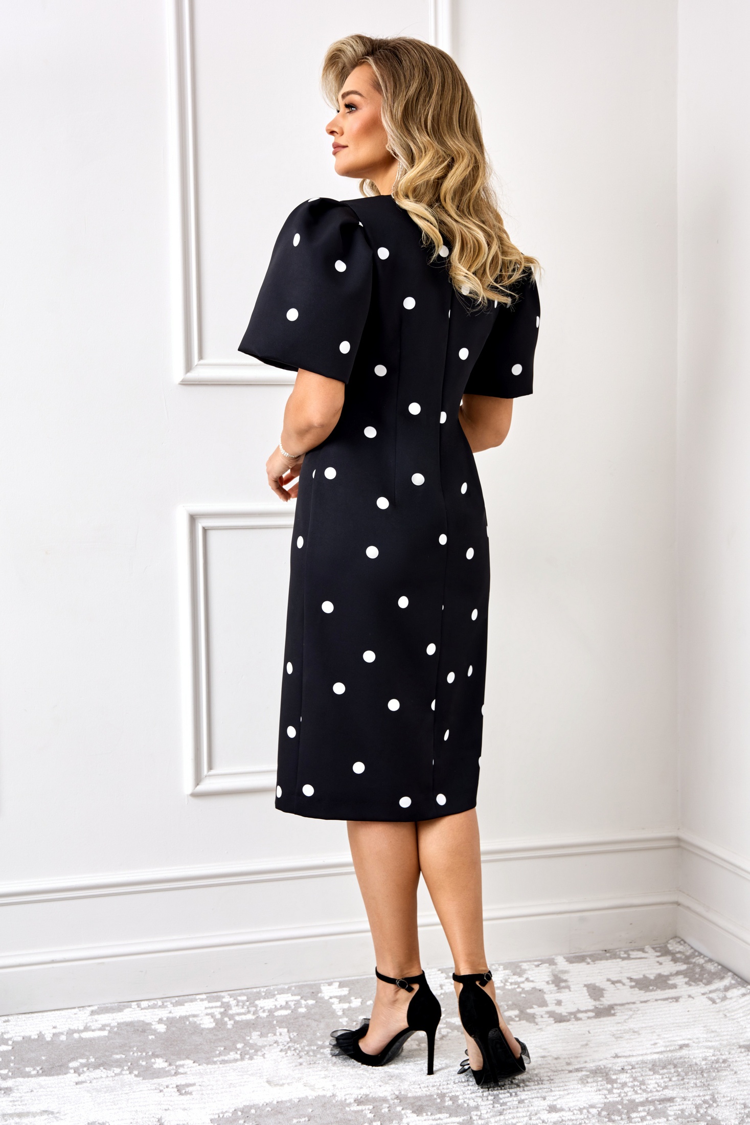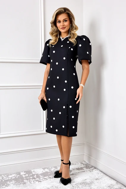 Роскошное нарядное платье, выполнено из плательной ткани Барби с добавлением вискозы с модным принтом горох. Платье с объемными рукава, что придает модели особый стиль и шарм. Платье прилегающего силуэта, вырез горловины округлый, по переду с разрезом и декорировано кружевом. По спинке платья потайная молния застежка. Модель прекрасно подойдет для торжественного мероприятия!