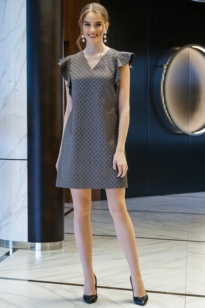 Платье полуприлегающего силуэта без застежки. Полотно средней плотности с небольшим содержанием стрейча. Перед с нагрудными вытачками. Спинка с талиевыми вытачками. Рукав –крылышко.