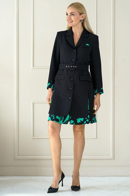 Платье женское имитация полуприлегающего силуэта, перед и спинка верху на подкладке понизу с притачной нижней юбкой, с застёжкой на петли и пуговицы, в дополнении съёмный пояс с обтянутой пряжкой. Перед с отложными лацканами, с рельефными швами заканчивающиеся понизу разрезом. По левой стороне верху с имитацией кармана с декоративным платком и прорезными карманами с клапаном с двумя обтачками. Спинка со средним швом и рельефными швами. Рукава втачные, двухшовные, длиной 7/8, понизу с притачными отложными манжетами. Воротник отложной с отворотом. Нижняя юбка, манжета рукава, платок верхнего кармана выполнены из отделочной ткани.