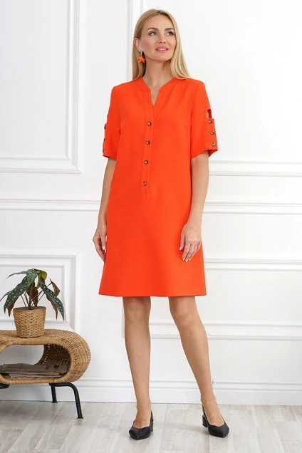 Платье женское, ткань плательно-костюмного ассортимента. Платье силуэта A- образной формы, с V- образным вырезом, застёжкой по притачной планке на петли пуговицы. Перед с нагрудными выточками. Спинка со средним швом. Рукава втачные, одношовные, низ с фигурным разрезом и притачными широкими манжетами на петли и пуговицы. Воротник стойка.
