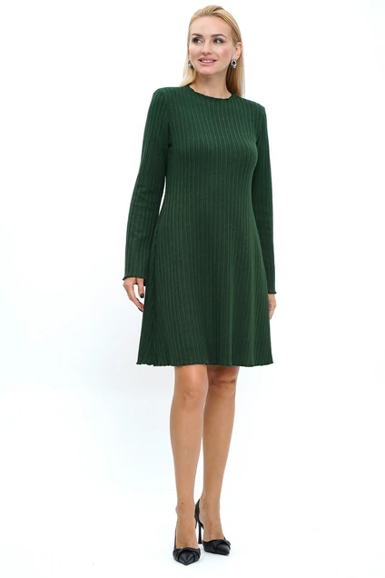 Платье А-образного силуэта с расширением книзу, с цельнокроеной стойкой, с втачными, одношовными, длинными рукавами книзу расширенные. Горловина, низ изделия и рукава обработаны узкой краеобмёточной строчкой «флешь».