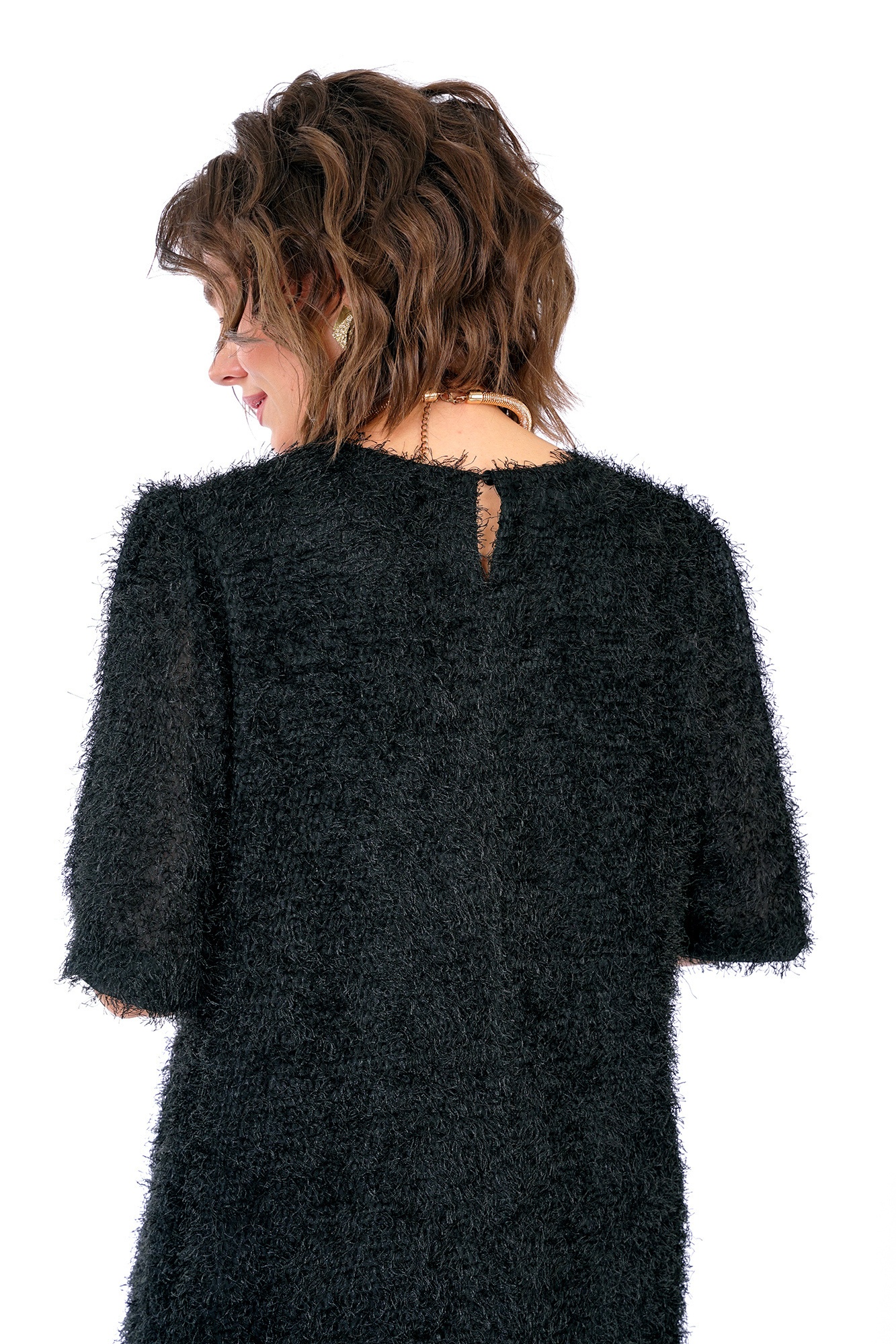 Платье А- образного силуэта, на подкладке. Перед с нагрудными выточками. Спинка со средним швом с разрезом и застёжкой на навесную петлю и пуговицу. Рукава втачные, одношовные, короткие.