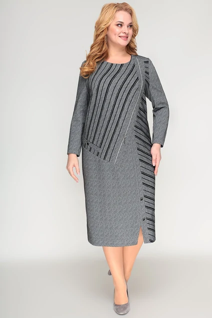 Женское платье прямого силуэта выполнено из трикотажной ткани в полоску и однотонной. Прямой силуэт не сковывает движения, в нём вы будете чувствовать себя комфортно в течении всего дня. Контрастное сочетание двух тканей по переду отлично выделяет платье и делает его ярче. На правой части переде платья есть нагрудная выточка, имитация листочки, а левая часть, декорированная молнией и вертикальной планкой, которая идёт до низу изделия. Резные линии по переду платья придают женскому облику изысканность и лаконичность. По низу переда платья есть небольшой разрез. Спинка со средним швом. Вырез горловины круглый. Рукав втачной, двух шовный, длинный. Комфортная модель для работы и просто для повседневного применения.