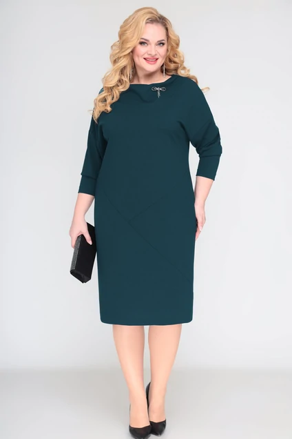 Нарядное однотонное платье на трикотажной подкладке станет красивым дополнением элегантного женственного образа. Универсальное и практичное изделие из трикотажной ткани длиной ниже колена. Этим сезоном безумно актуальными являются наряды со спущенными плечами. Спинка платья со швом. Свободный крой в области талии и бёдер дарит приятное чувство уверенности и комфорта. На передней полочке платья есть косые подрезы, кокетка, а в левой боковой части карман с отрезным бочком. Вырез горловины в виде небольшой качели, декорирован съемной брошью. Рукав со спущенной линией плеча, длинный. Отличный вариант для офиса и вечернего гардероба, а также и просто для повседневного применения.