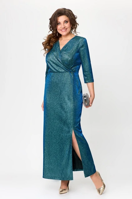 Платье больших размеров выполнено из качественного трикотажного полотна с приятным блеском, на трикотажной подкладке. Ткань мягкая, очень приятная к телу. Верхняя часть платья переда отрезная по линии талии. Лиф переда с эффектным запахом и рельефным бочком. Красивый, оригинальный разрез по переду придает наряду некоторую кокетливость, превращая строгое платье в милое и молодежное секси. Спинка со средним швом.Рукав втачной, длиной ¾. Платье со съёмным поясом. Вечернее платье подойдет на новый год, вечеринку, в клуб, на свадьбу и любой другой праздник