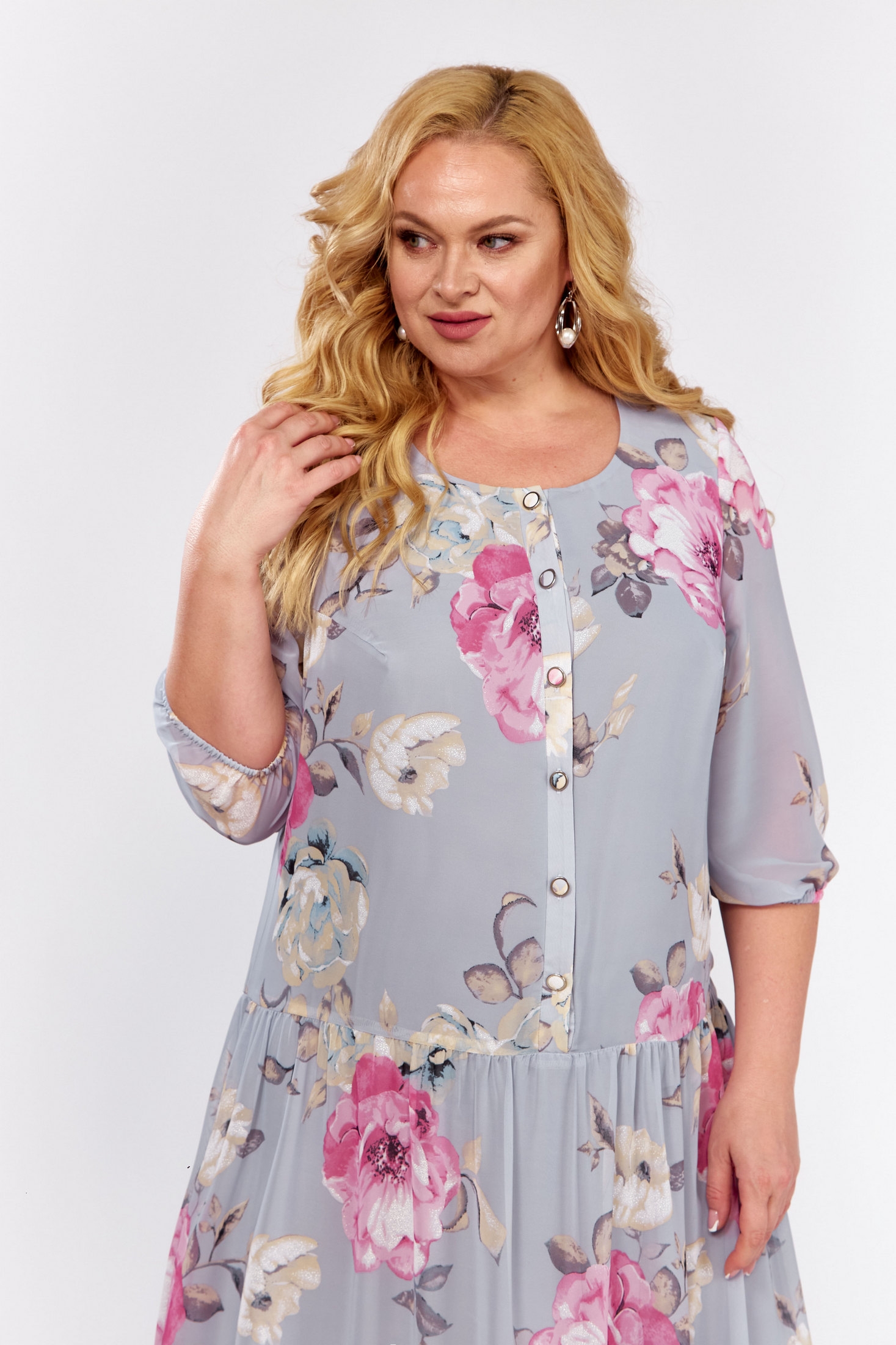 Легкое, воздушное платье из шифона на трикотажной подкладке для женщин подарит ощущение летнего бриза даже в самый знойный день. Этот элегантный наряд обязательно привлечет внимание окружающих! Нежный дизайн ткани добавляет шарм и делает его по-настоящему женственным. Крой А-силуэт нарядного изделия подходит как для повседневного образа, так и для особых случаев. Силуэт модели выделяет женственность фигуры и делает образ стильным. Платье создано для тех, кто предпочитает удобство и стиль в одном флаконе. Миди-длина платья и воланы подчеркнут грацию фигуры и добавят загадочность Вашему образу. Перед платья частично на застежке на петли и пуговицы. Рукав втачной, 3/4, по низу на резинке. Выбрав эту модель, Вы точно будете выглядеть неповторимо на любых мероприятиях!