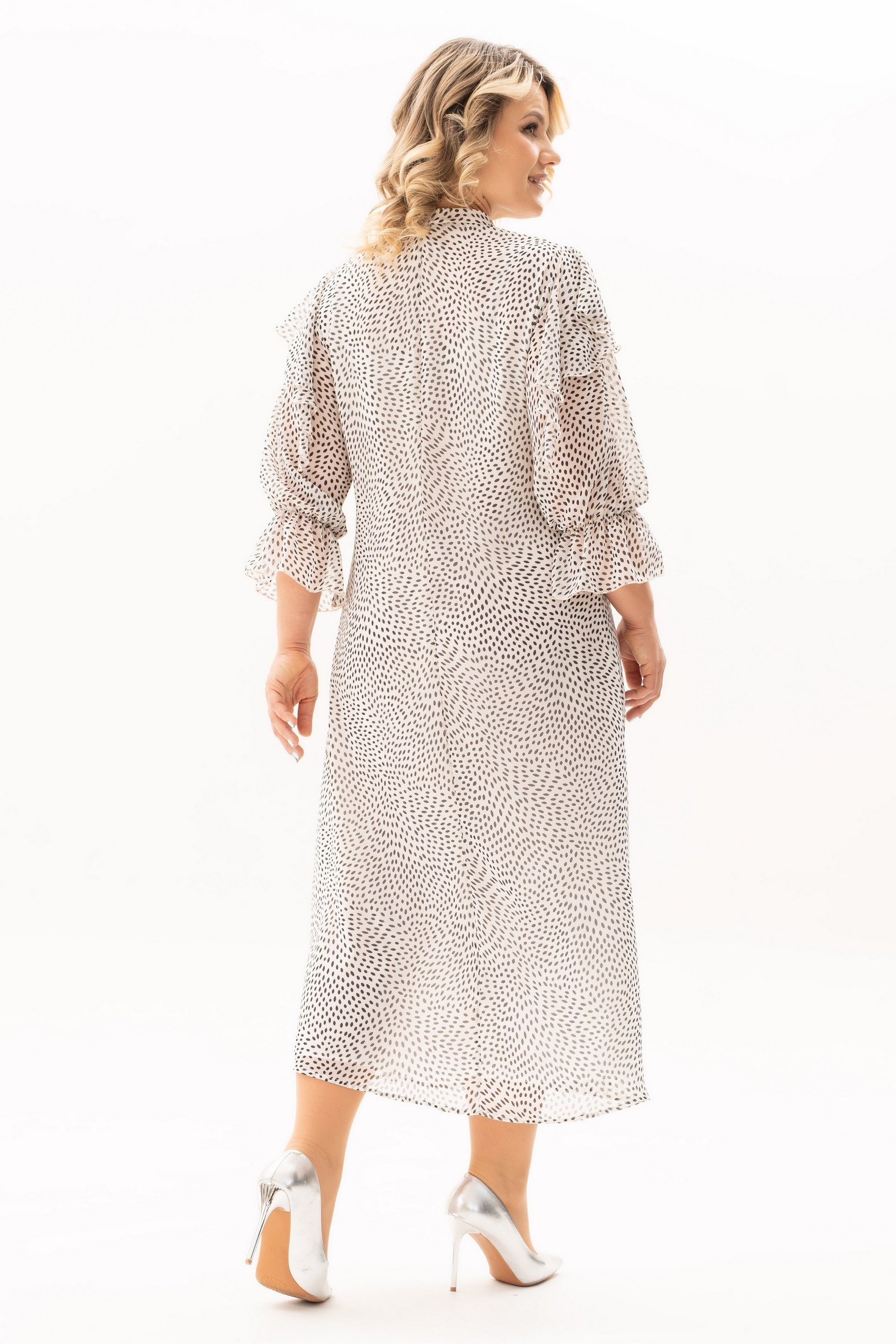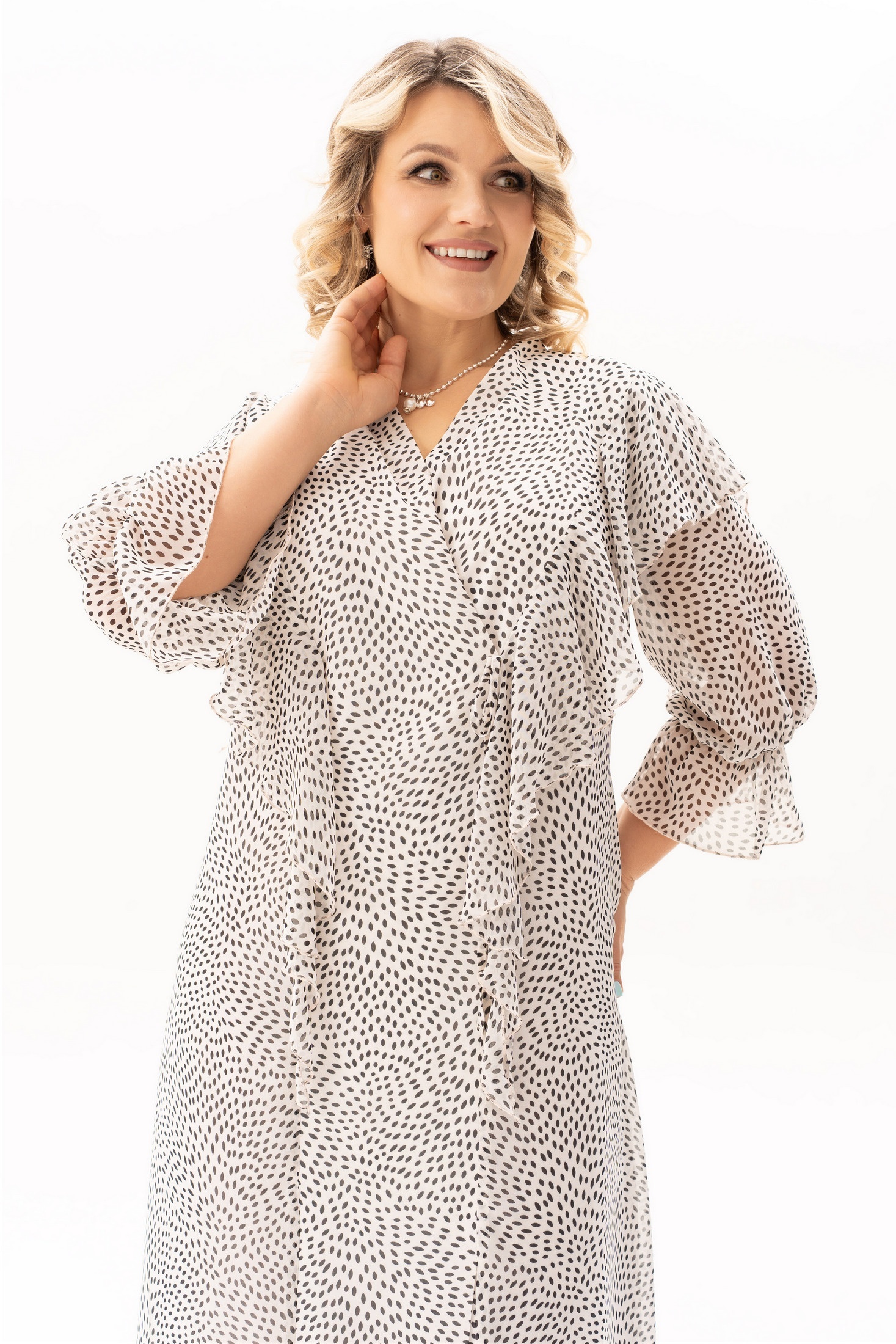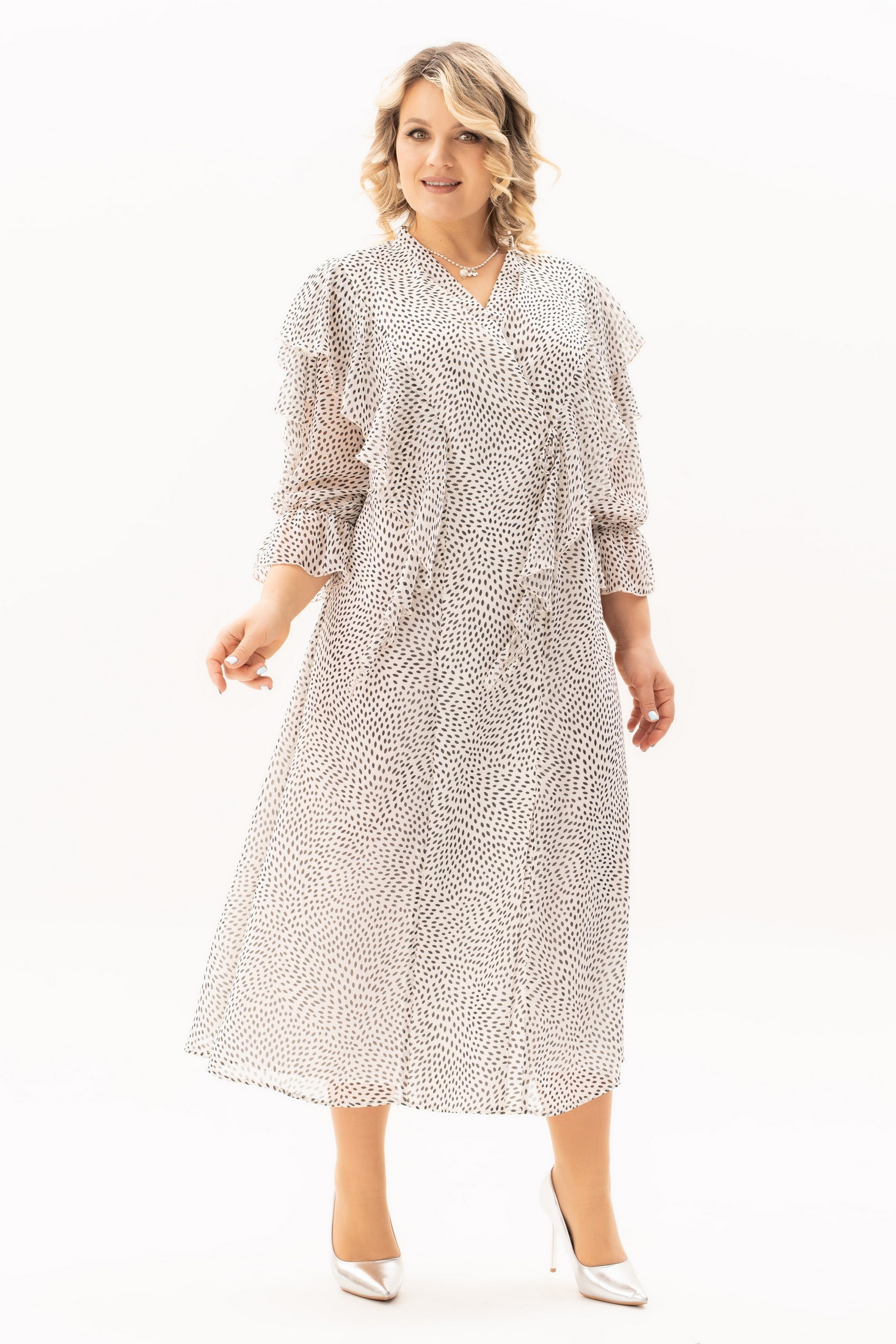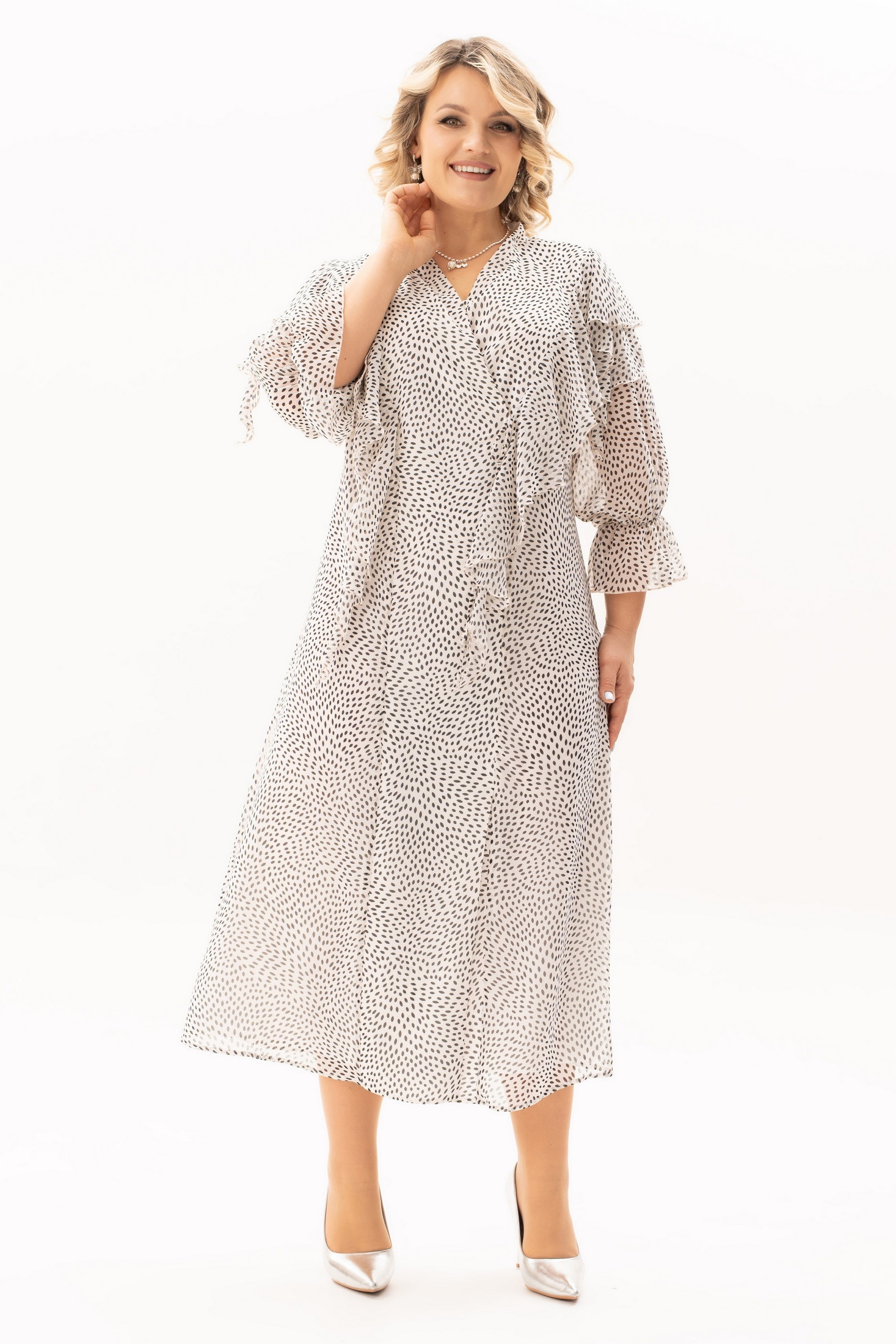 Платье 4139 Algranda от коллекции бренда Новелла Шарм выполнено из премиального шифона, обеспечивая легкость и комфорт в теплое время года. V-образная горловина и длина миди делают его универсальным выбором для весны и лета. Оригинальный принт и рукава ниже локтя добавляют нотку романтичности, идеально подходя как для повседневного использования, так и для особых мероприятий. Легкий материал красиво драпируется, создавая изящные складки. Светлый цвет изделия добавляет образу нежность и свежесть.