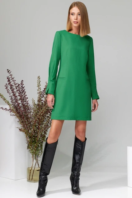 Платье А-образного силуэта из трикотажного полотна. Перед со средним швом, талиевыми вытачками и карманами с листочками. Спинка со средним швом и талиевыми вытачками. В верхней части среднего шва потайная молния. Рукав втачной двухшовный с застроченной встречной складкой по низу. Средний шов, талиевые вытачки по переду, низ рукава и низ платья отстрочены декоративной строчкой. Длина платья - 91 см, длина рукава - 61 см. Рост 164