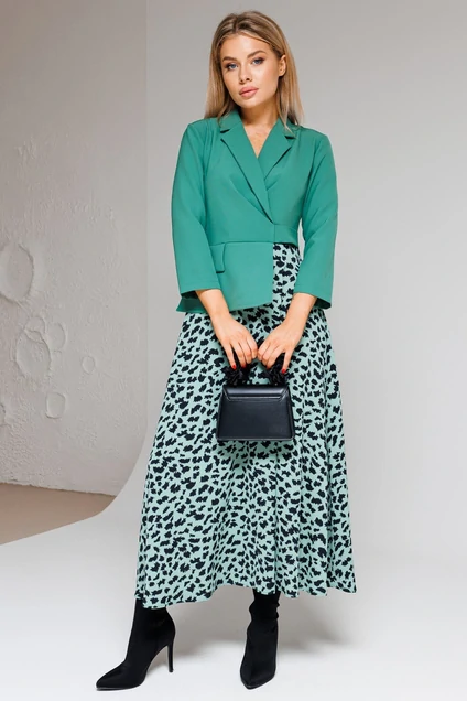 Платье женское прилегающего силуэта, расклешенное к низу. По переду платья нагрудные складки, воротник пиджачного типа, застежка с имитацией запаха. С переди по талии отдельная фигурная баска с клапаном. Спинка со средним швом и талиевыми вытачками. Рукав одношовный 7/8.Юбка притачная по талии полусолнце. В боковом шве платья застежка на потайную тесьму-молнию