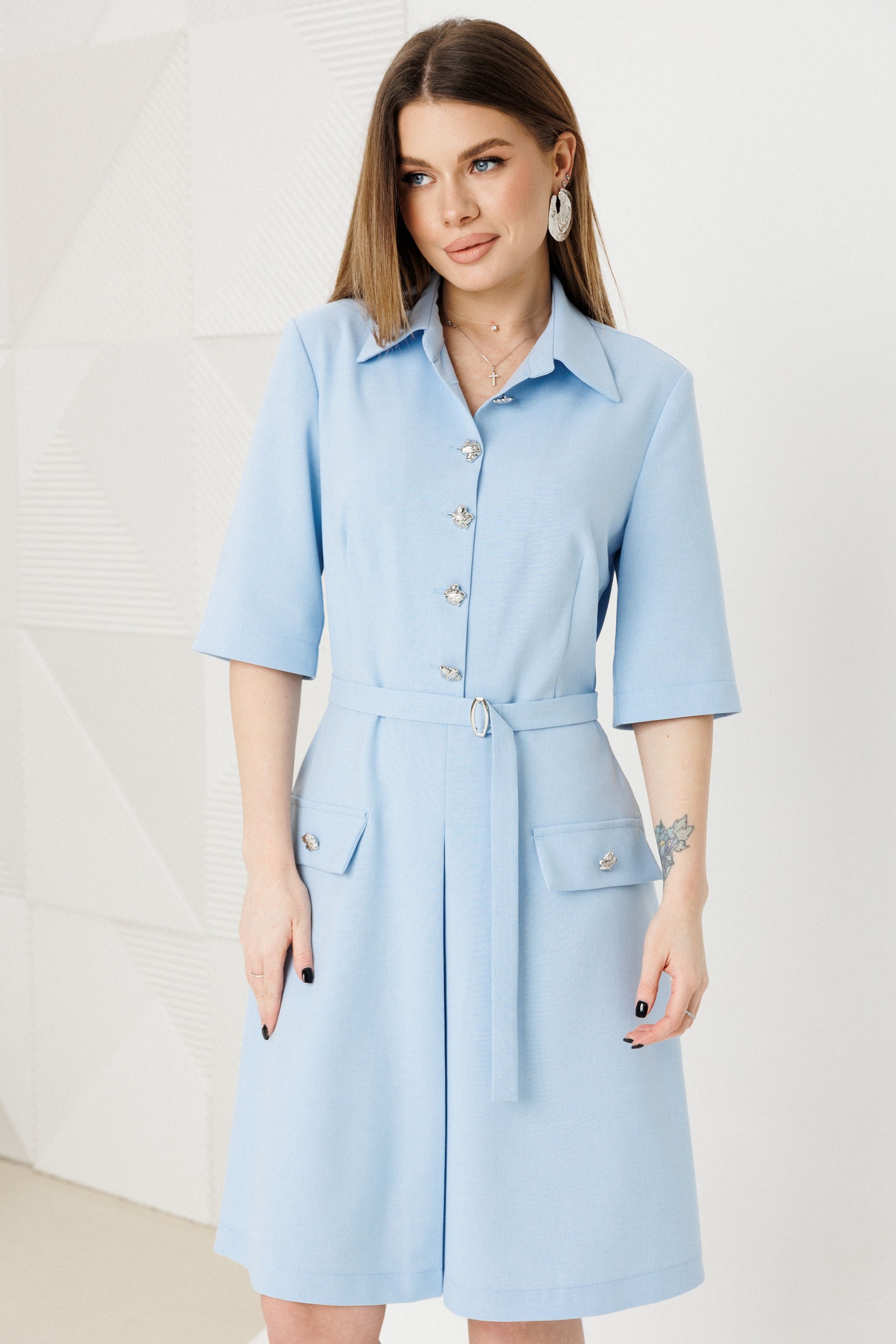 Платье 1140 голубой Ambera style представляет собой изысканное платье-рубашку, идеально подходящее для весенне-летнего сезона. Коллекция бренда Ambera style создана из лёгкой костюмно-плательной ткани, состоящей из вискозы и нейлона, обеспечивая комфорт и стиль в течение всего дня. Приталенный силуэт подчёркивает фигуру, а металлические пуговицы и пояс с пряжкой добавляют уникальности. Голубой цвет делает это платье свежим и подходящим для различных мероприятий, начиная от работы до дружеской встречи. Идеальный выбор для тех, кто ценит стиль и комфорт одновременно.