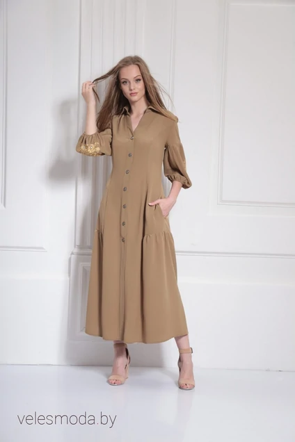 Платье с очень насыщенной дизайнерской вышивкой по объемным рукавам. Застежка по пердуна петли и пуговицы. Изделие без подкладки. Карманы в боковых швах.