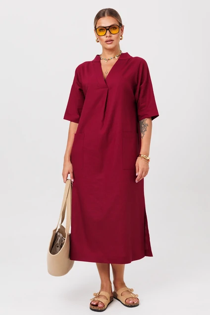 Свободное легкое женское платье из текстильной ткани. Идеальный вариант в жаркую погоду для офиса, прогулки или праздничного выхода. Достаточно обыграть его подходящими аксессуарами и обувью. Платье женское прямого силуэта со спущеныи плечом, по бокам разрезы,по полочке идут накладные карманы. Вырез V-формы с планками и защипом, по горловине стойка. По спинке идет встречная складка. Длина (по спинке): (50-54)-120см. Длина рукава (50-54)-22см.