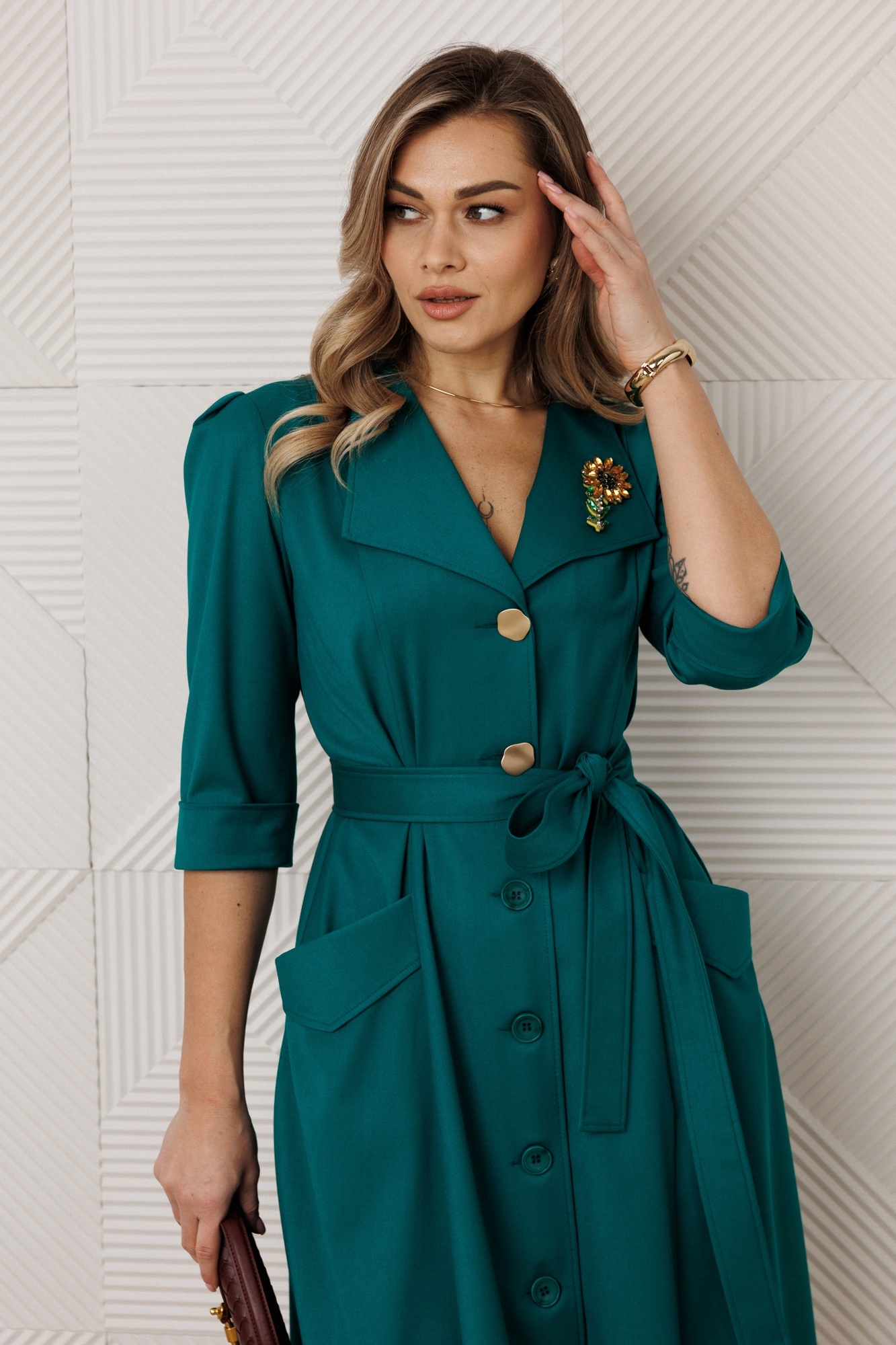 Платье 1318-1 изумруд Anastasia – это красивое дизайнерское изделие для женщин плюс сайз от коллекции бренда Anastasia. Выполнено из смеси полиэстера, вискозы и спандекса, что обеспечивает комфорт и легкость. Полуприлегающий силуэт с рельефами и юбкой-гаде подчеркнут вашу фигуру. Оборудовано воротником стояче-отложным и застежкой на пуговицы. Фасон платья дополнен карманами с клапанами и декоративной брошью. Рукав длиной 3/4 с манжетой и складками придает изделию изысканность. Длина платья варьируется от 115 до 118 см, в зависимости от размера. Изумрудный цвет подчеркнет вашу индивидуальность. Идеально для осеннего сезона и подойдет как для работы, так и для праздника. ВНИМАНИЕ: брошь может отличаться от фото.