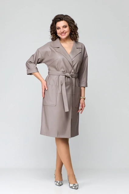 Платье прямого силуэта, выполнено из экокожи. Полочка с нагрудными вытачками, по нижней части разрезная с накладными карманами. Застежка двубортная на четыре петли и пуговицы. Горловина V-образной формы с отложными лацканами и воротником пиджачного типа. Спинка со средним швом. Пройма углубленной формы, рубашечного типа. Рукав длиной 3\4, по низу с цельнокроеной отложной манжетой. В области талии по боковым швам настрочены шлевки, через которые продет пояс, завязывающийся спереди.