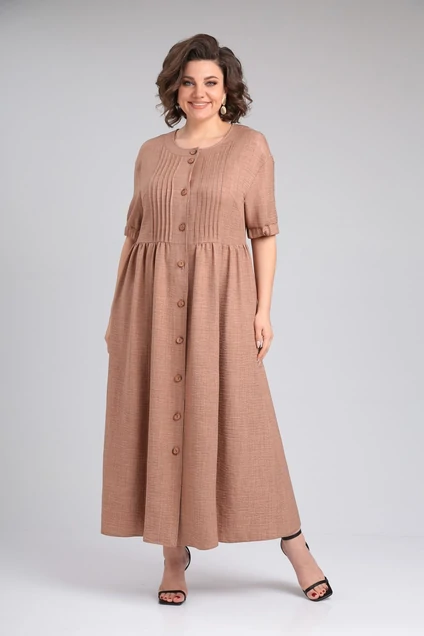 Платье свободного силуэта, длиной макси, выполнено из однотонной ткани. Платье с отрезным лифом и с центральной застежкой на петли и пуговицы. Полочка лифа с нагрудными вытачками и вертикальными защипами, горловина круглой формы с притачной планкой. Спинка с талиевыми вытачками. Пройма углубленной формы. Рукав рубашечного типа, одношовный, длиной до локтя. По низу рукава обработана притачная манжета с эластичной тесьмой. Юбка платья с вертикальными рельефами по передней и задней частям, со сборкой по шву притачивания к лифу. В боковых швах обработаны прорезные карманы.