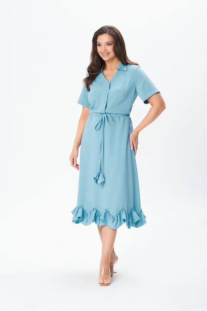 Платье отрезное по линии талии. Полочка лифа платья с нагрудными вытачками и центральными притачными планками с застежкой на петли и пуговицы. Горловина V-образной формы, воротник рубашечного типа. Спинка лифа цельная. Рукав втачной,