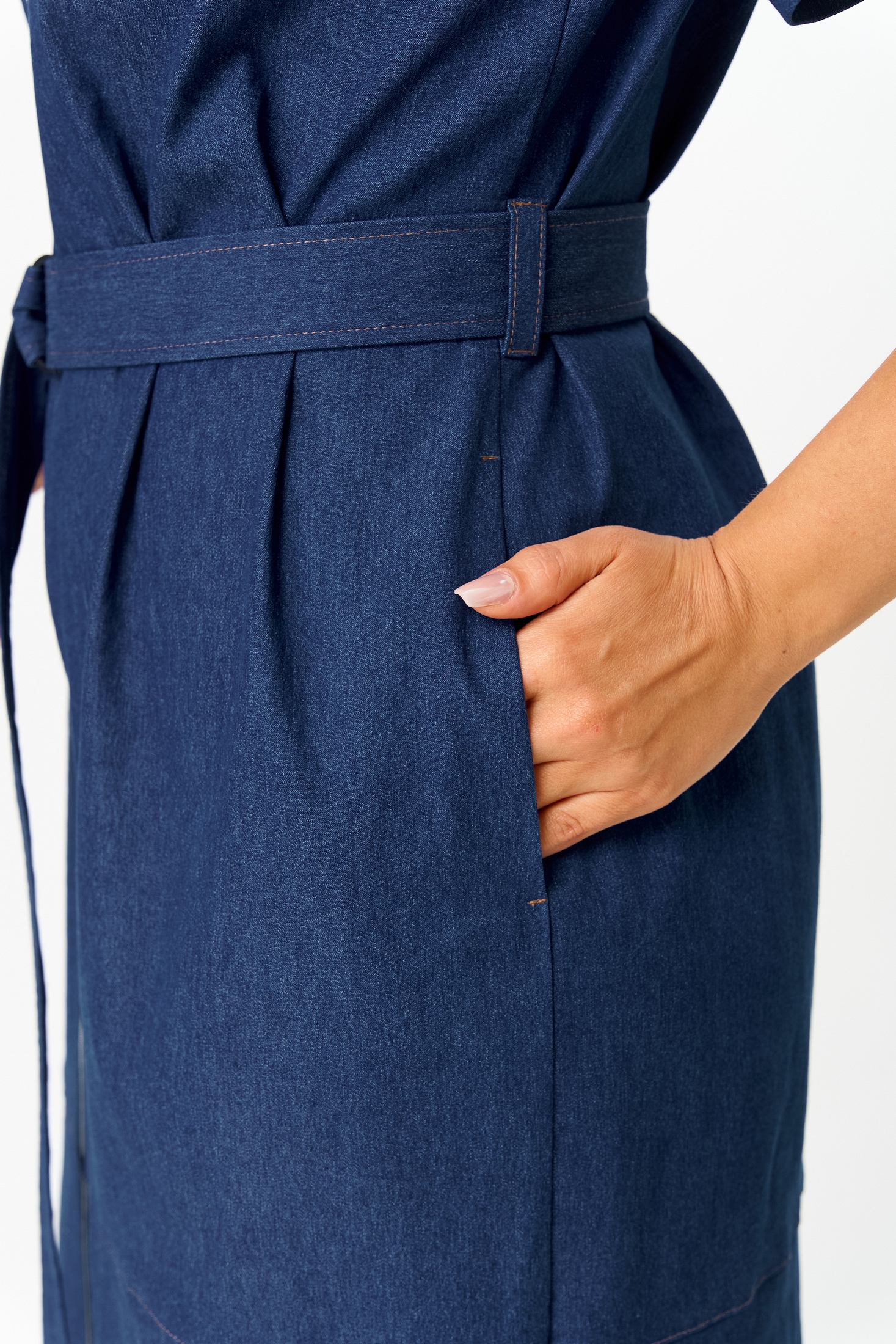 Платье полуприлегающего силуэта, выполнено из джинсовой ткани. Платье длиной ниже колена. Полочка платья с центральной застежкой на молнию. Горловина круглой формы с V-образным разрезом. Полочка и спинка с отрезной плечевой кокеткой. С правой стороны полочки, в верхней части, настрочена декоративная нашивка. Средняя часть полочки с нагрудными вытачками. Средняя часть спинки цельная. Нижняя часть платья притачная. В боковых швах обработаны карманы. В области талии , по боковому шву настрочены шлевки, через которые продет пояс , крепящийся спереди на полукольца.