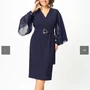 Полочка разрезная по линии талии, лиф платья с имитацией запаха и отрезными бочками. Горловина V-образной формы. Нижняя часть полки с талиевыми вытачками. Спинка со средним швом, в верхней части которого обработана потайная молния, в нижней части разрез. Спинка с талиевыми вытачками. По боковым швам в области талии настрочены шлевки, через которые продет пояс, крепящийся спереди на пряжку. Рукав платья выполнен из шифона. Рукав длинный, одношовный, с драпировкой, обьемный к низу. Низ рукава на притачной манжете с застежкой на петлю и пуговицу