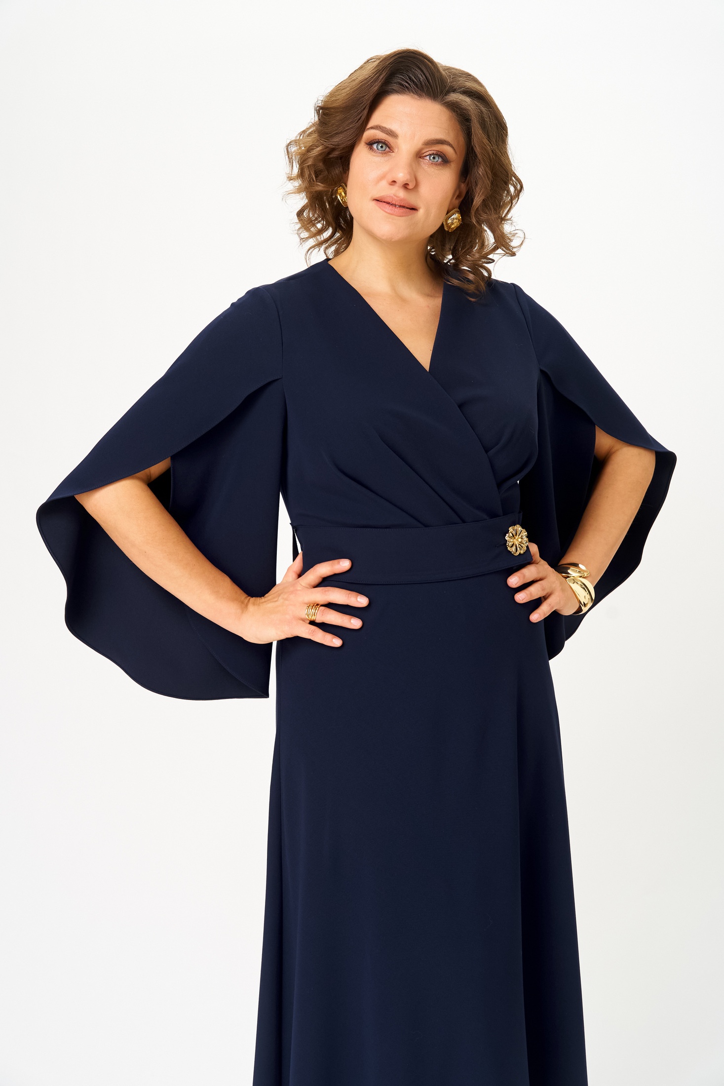 Платье отрезное по линии талии. Полочка с иммитацией запаха и складками по линии талии. Горловина V-образной формы. Спинка с талиевыми вытачками. Рукав втачной, обьемный к низу, с драпировкой. Юбка полуприлегающая по бедрам, свободная и широкая по низу. По боковым швам в области талии настрочены шлевки, через которые продет пояс, крепящийся на пуговицу.