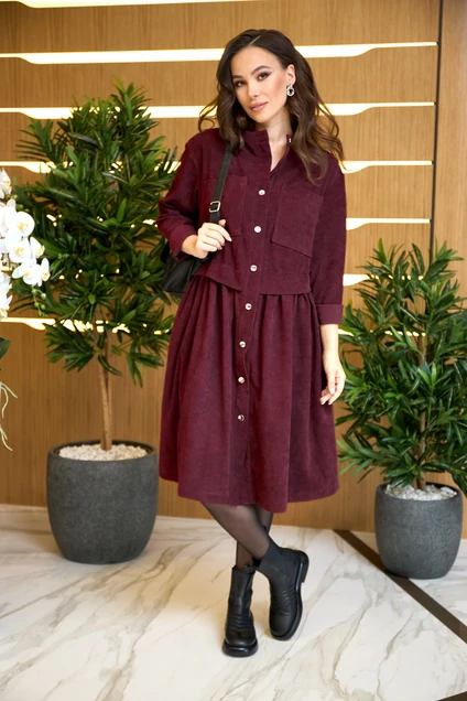 Платье прямого силуэта, длиной за колено, выполнено из вельвета в мелкий рубчик. Полочка платья с отрезной планкой по центру и застежкой на петли и пуговицы. Лиф платья отрезной, со складкой по низу, к срезу которой притачана юбка со сборкой. Полочка лифа с нагрудными вытачками и накладными карманами. Горловина круглой формы обработана воротником-стойкой. Пройма углубленной формы с рукавом рубашечного типа, рукав длинный, одношовный. В боковых швах юбки обработаны карманы.