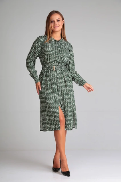 Платье-рубашка свободного кроя. По центру расположена полочка, потайная застёжка на пуговицы. Воротник рубашечного типа, сверху кокетка с отстрочной (имитацией отлетной). На спинке также выполнена кокетка, имитирующая отлетную; и бантовая складка по центру. В боковых швах расположены карманы.Рукав рубашечного типа с манжетой и застёжкой на пуговицу. В комплект входит пояс на резинке с матовой пряжкой, выполненый из той же ткани что и платье. Длина вдоль середины спинки 109 см.
