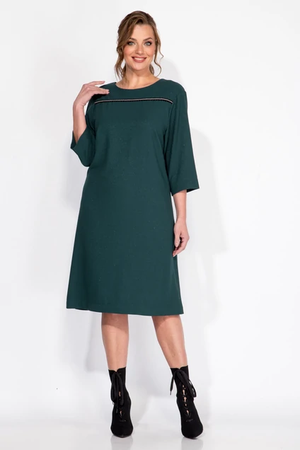 Платье женское свободного кроя расширенное к низу, выполнено из качественного трикотажа средней плотности с добавлением блестящей нити, что создает образ более нарядным. На полочке нагрудные выточки, в области груди - отделочная тесьма, имитирующая кокетку. По спинке - центральный шов с разрезом. Сзади у горловины застежка на нависшую петлю и пуговицу. Рукав широкий, свободный, 3/4.