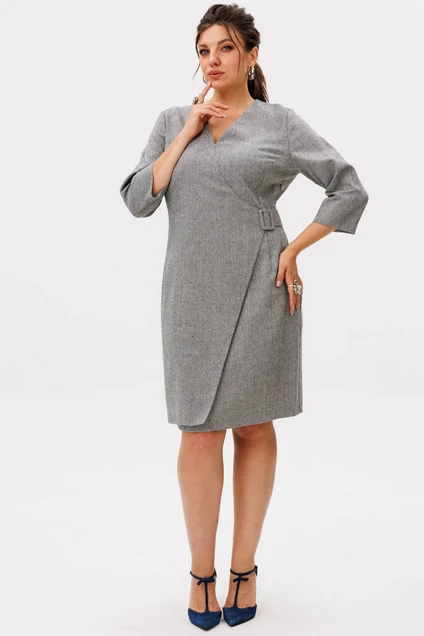 Особую изюминку передней части платья придает отлетная деталь с эффектом запаха, декорированная изящной пряжкой, обтянутой основной тканью. Задняя часть с застежкой на потайную молнию обеспечивает идеальную посадку по фигуре.
