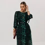 Полуприлегающий силуэт, отрезное по линии талии. Круглый вырез горловины с притачной обтачкой и маленькими складочками придают образу изюминку и особое очарование. Низ платья - летящее полусолнце.