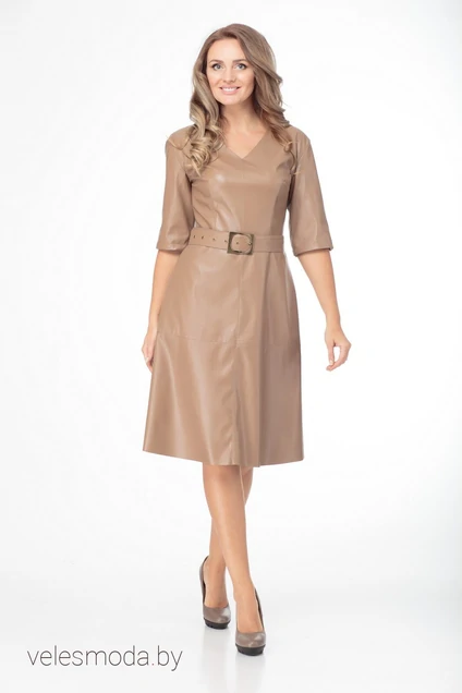 Полуприлегающий силуэт, отрезное по линии талии, слегка спущенные плечи, рукав 3/4, V-образный вырез горловины, правильная длина ниже колена, нагрудные и талевые вытачки. Застежка на потайную молнию в среднем шве спинки.