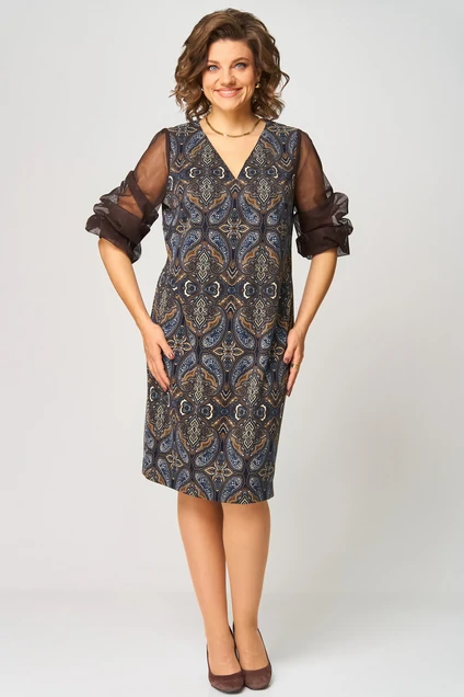 Платье полуприлегающего силуэта с горловиной V-образной формы. Перед с нагрудными вытачками. Спинка с талиевыми вытачками и разрезом в среднем шве. Рукав прозрачный из сетки, втачной прямой длинный, на резинке по низу. Длина платья: 103 см