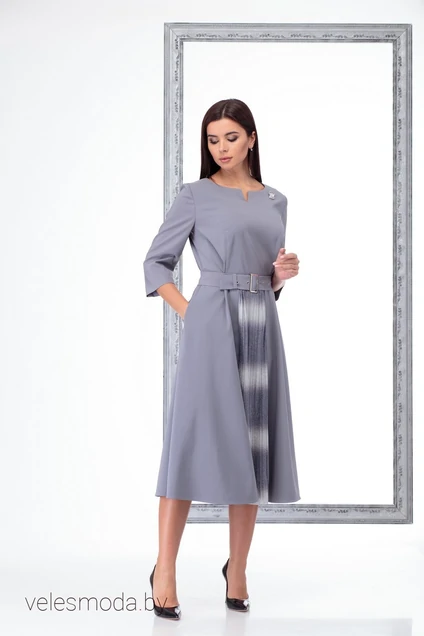 Классическое женское платье отрезное по линии талии. Лиф платья по переду с рельефными швами, на горловине небольшой декоративный разрез. Спинка лифа со средним швом, в котором находится потайная молния. Приталивание спинки лифа достигается при помощи талиевых вытачек. Юбка платья полусолнце, посредине переда юбки декоративная вставка гофре. Рукав прямой 3/4, одношовный. Горловина платья обработана обтачкой. Модель подойдет на рост 164-170 см. К платью прилагается съемный пояс. Длина изделия по спинке 115 см