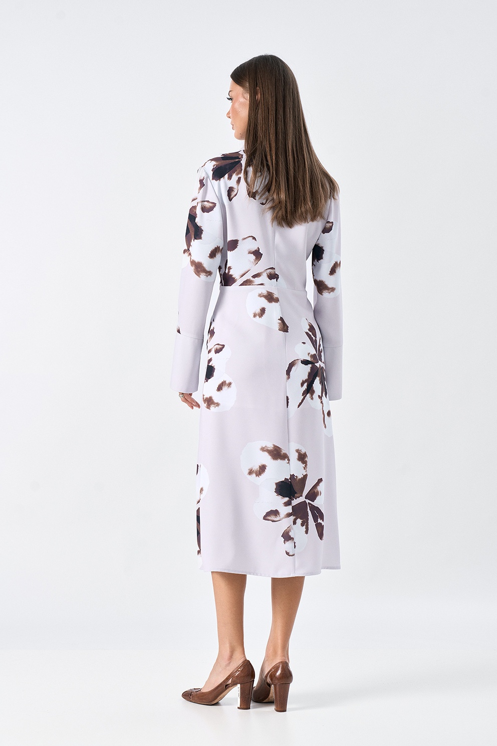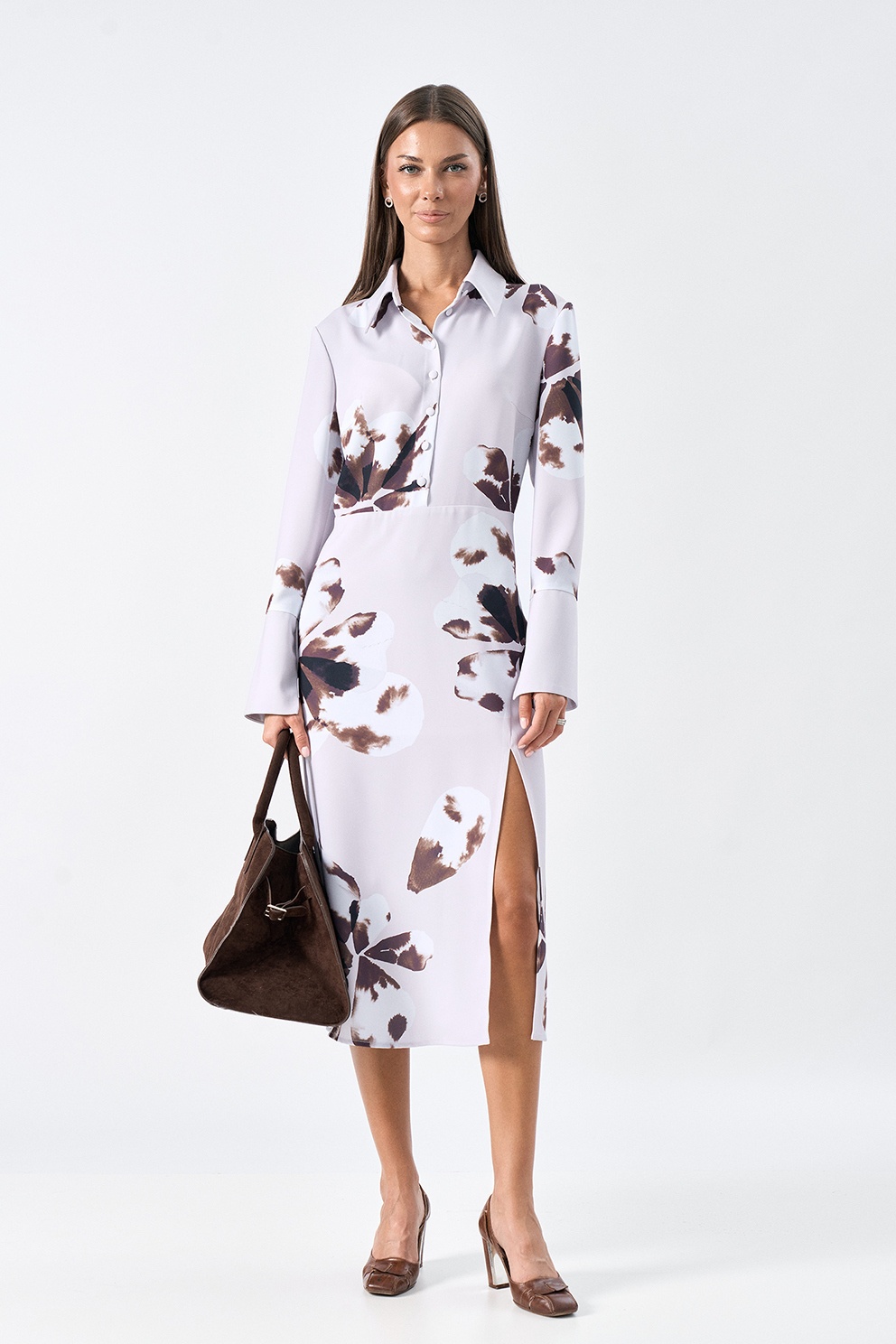 Элегантное женское платье миди, выполненное из лёгкой костюмной ткани в пастельно-розовом цвете с большим цветочным принтом в коричневых и чёрных оттенках. Модель полуприлегающего силуэта с классическим воротником-стойкой и длинными рукавами подчеркнет изысканность образа. Платье застёгивается на петли и пуговицы по всей длине изделия, а также оснащено скрытой молнией в боковом шве для удобства надевания. Идеальный выбор для деловых и торжественных событий.